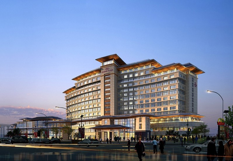 項(xiàng)目位于江蘇省揚(yáng)州市,北臨文昌大橋,西臨京杭大運(yùn)河,南臨湖濱規(guī)劃道路,東靠京杭路,是揚(yáng)州廣陵新城“京杭之心”規(guī)劃區(qū)域內(nèi)重要的建筑。揚(yáng)州市東部,北臨文昌大橋,西臨京杭大運(yùn)河,南臨大湖,東靠京杭路。項(xiàng)目利用基地內(nèi)的多種自然條件和景觀優(yōu)勢(shì),平面布置呈東西走向,沿南側(cè)水體弧線舒展布局,使景觀價(jià)值在每間客房得到充分的體現(xiàn),按照廣陵新城的規(guī)劃設(shè)計(jì)理念,建筑與湖心形成向心關(guān)系,體現(xiàn)出完整的的濱水空間,創(chuàng)造豐富的親水體驗(yàn)。建筑立面風(fēng)格,端莊氣派,立面設(shè)計(jì)成三段式的處理,建筑底部為石材面飾,彰顯氣派厚重感;中間為虛實(shí)對(duì)比的分層條窗,頂部為簡(jiǎn)約的坡屋頂,整體建筑極具現(xiàn)代感又不失對(duì)地域文化的詮釋。